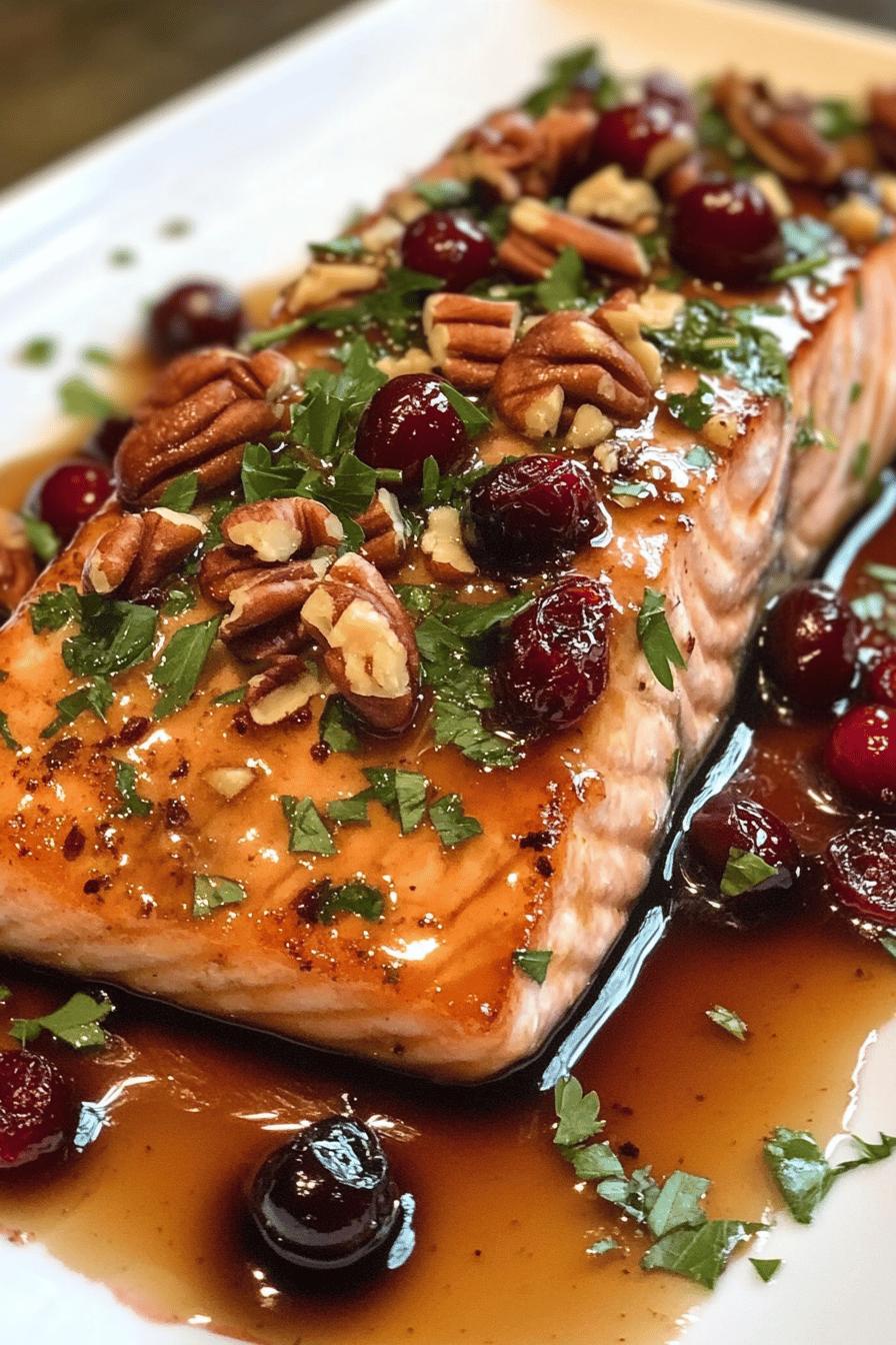 Finally, it’s time to add the finishing touches. Remove the skillet from the heat and sprinkle the chopped pecans and fresh herbs over the glazed salmon. The pecans add a lovely crunch, while the herbs provide a fresh burst of flavor. Serve the Maple Cranberry Glazed Salmon immediately, garnished with extra cranberries if desired. Enjoy this beautiful dish with your favorite sides for a complete meal!